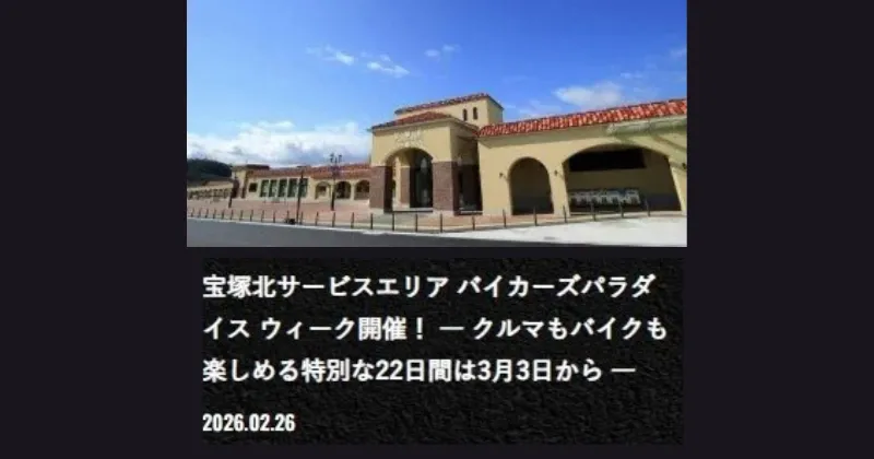 イマドキのバイク文化の発信拠点「バイカーズパラダイス」は、宝塚北サービスエリアにおいて、2026年3月3日(火)から3月22日(日)までの期間、バイクファンはもちろん、クルマで来場されるファミリー層も楽しめるスペシャルイベントを開催いたします。